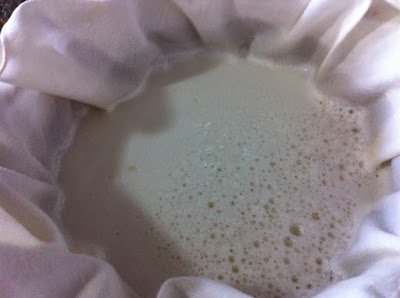 Despejar a massa (coágulo) num pano de algodão sobre uma peneira.